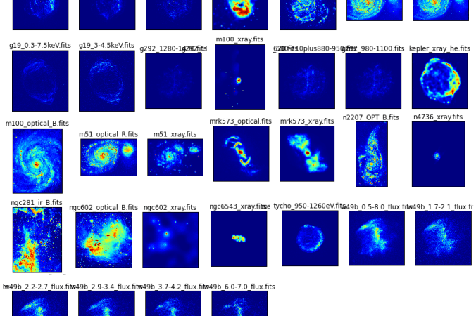 One of the most widely used formats for astronomical images is the Flexible Image Transport System. In a FITS file, the image is stored in a numerical array. The FITS files shown below are some of the publicly available ones downloaded from the following sites: