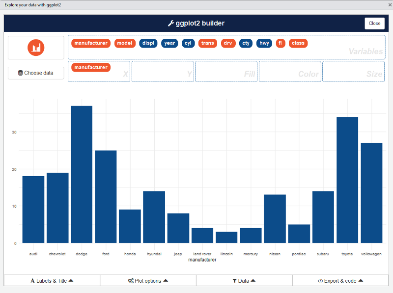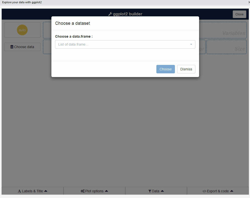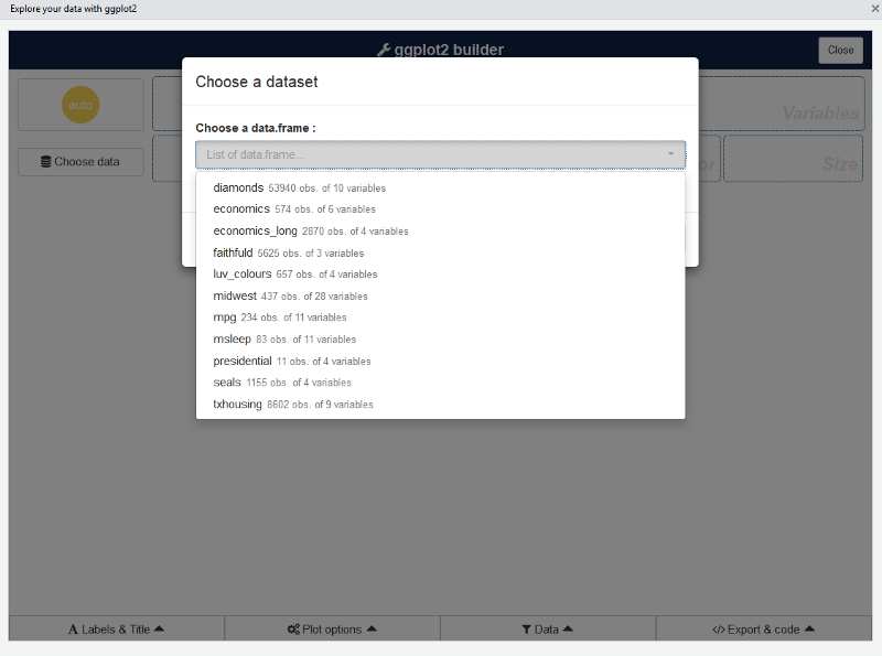 Then launch the add-in via the RStudio menu. If you don’t have data.framein your environment, datasets in ggplot2 are used.