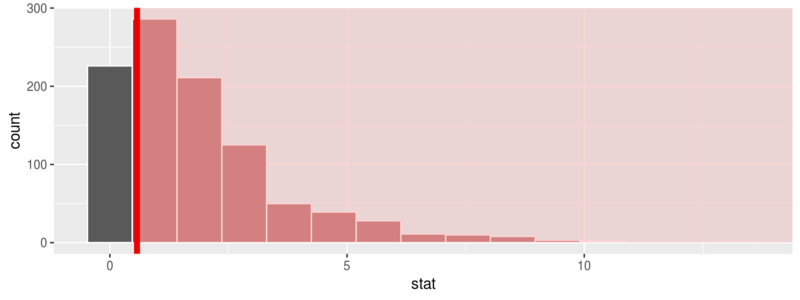 One of the greatest parts of this library is the visualize function. This will allow you to visualize the distribution of the simulation-based inferential statistics or the theoretical distribution (or both). For an example, let’s use the flights data set. First, let’s do some data preparation: