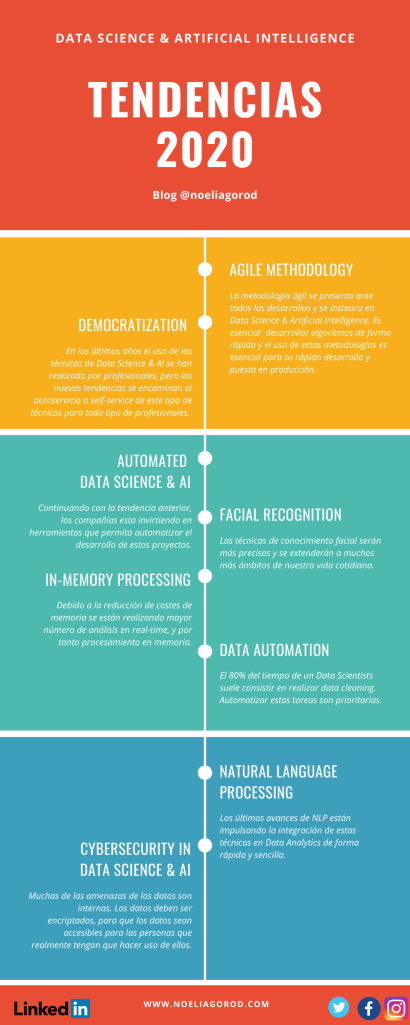 Comenzamos el mes de Febrero de este especial año 2020 con un análisis de las tendencias que los gurus a nivel mundial han realizado sobre lo que nos tiene que llegar en este año relacionado con la Inteligencia Artificial y Data Science. Para ello he realizado una breve infografía para resumir todas estas tendencias y os dejo diferentes enlaces con más información. Espero sean de vuestro interés y podemos seguir ampliando estas tendencias con vuestras aportaciones en los comentarios del post!.