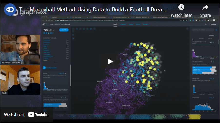 Next, we zoomed in on the value range 0 – 10M and applied color and size mapping to this variable to give us an immediate indication of the value of players as we scanned the Graph. Finally, using the position of each player on the Graph, we created shortlists for each position.