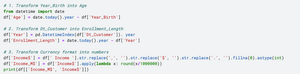 - transform currency («Income») into numbers («Income_M$») This involves four steps: 1) clean data to remove characters «, $ .» 2) substitute null value to 0; 3) convert string into integer; 4) scale down the numbers into million dollar which helps with visualizing the data distribution