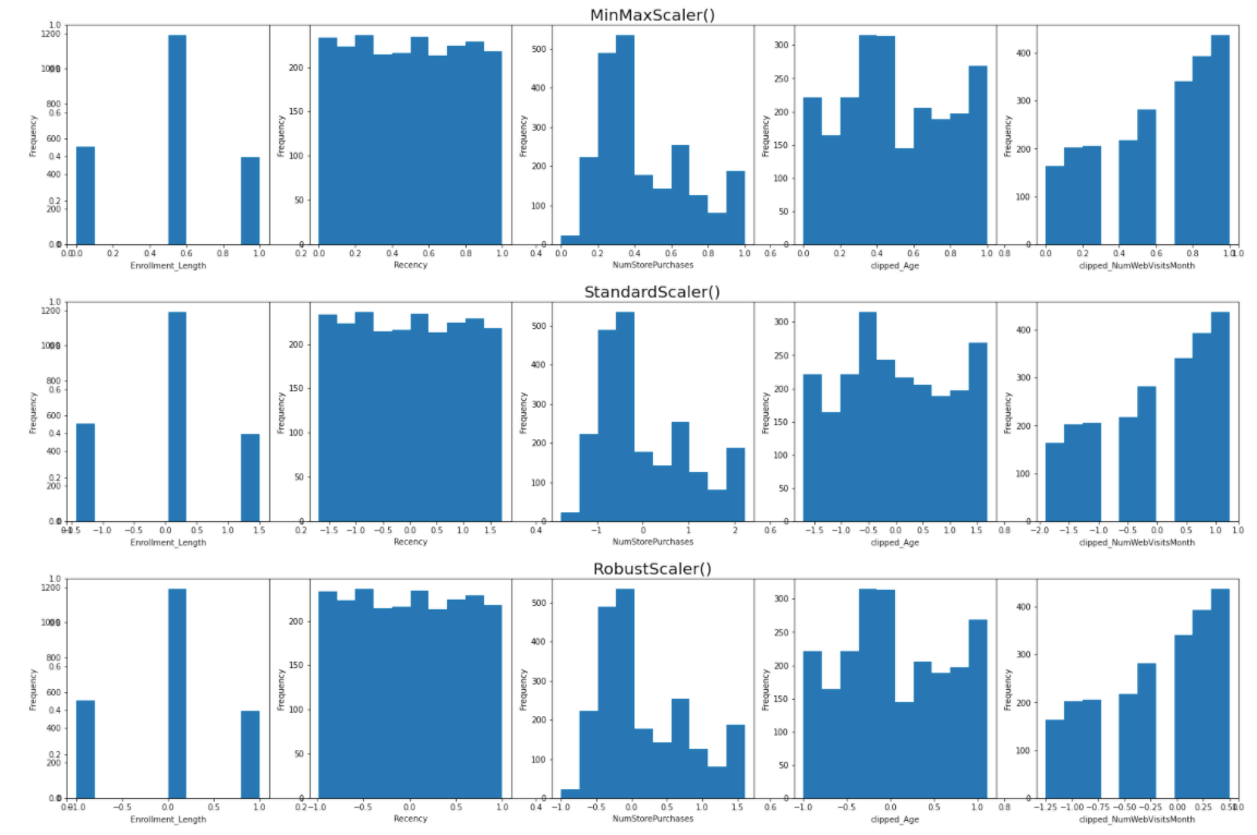 To compare how these three scalers work, I use an iteration to scale the remaining variables (including two variables after clipping transformation) based on StandardScaler(), RobustScaler(), MinMaxScaler() respectively.