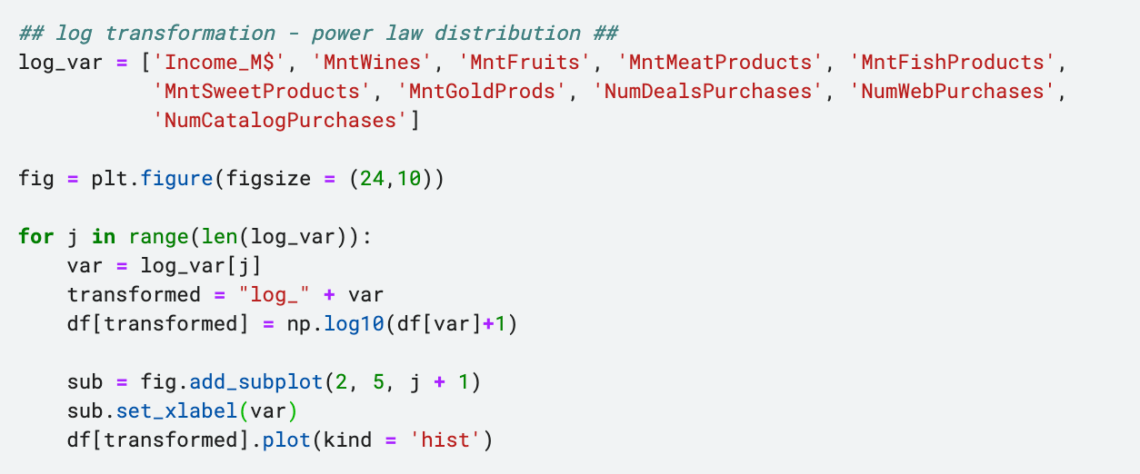 When the data sample follows the power law distribution, we can use log scaling to transform the right skewed distribution into normal distribution. To achieve this, simply use the np.log() function. In this dataset, most variables fall under this category.