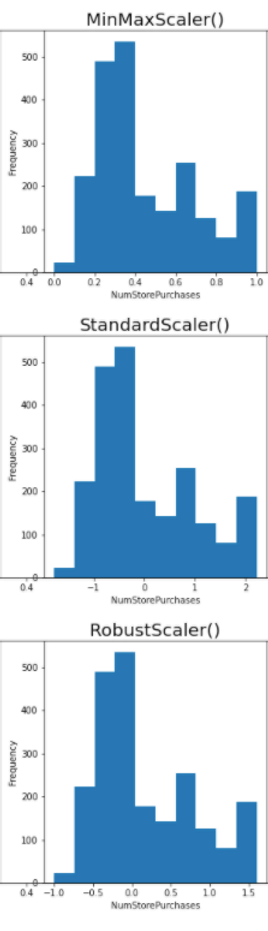 Take «NumStorePurchases» as an example, minmax scaler converts the values to be strictly between 0 and 1, standard scaler transform dataset into mean = 0 whereas robust scaler transform dataset into median = 0.