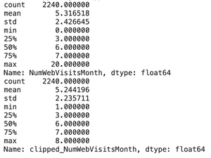 From the histogram in the EDA process, we can see that variable «Age» and «NumWebVisitsMonth» have outliers with extraordinary large numbers. So I will only apply clipping to these two columns.