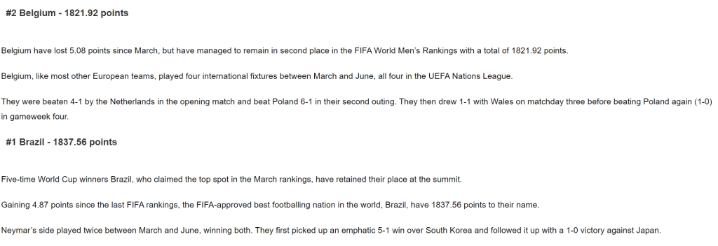 - FIFA rankings: Top 10 nations. Using the points calculation performed by FIFA, the winner of this tournament would be Brazil, playing in the final with Belgium.