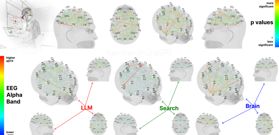 Figura – Análisis de conectividad cerebral en banda alpha mediante EEG (dDTF) para los grupos: solo cerebro, búsqueda web y LLM (IA generativa). Los colores más cálidos indican redes neuronales más fuertes; se observan diferencias significativas en la conectividad frontoparietal y temporal, siendo más débiles en el grupo que usa IA.