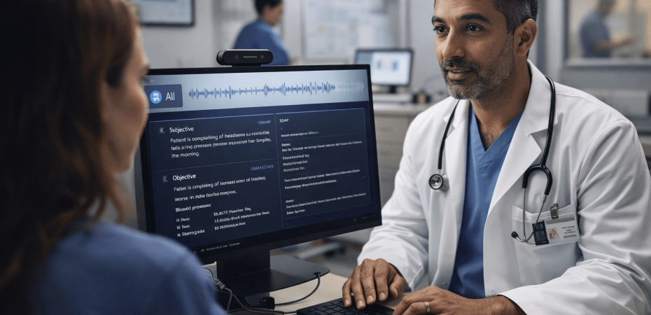 Estos sistemas utilizan modelos de lenguaje y reconocimiento de voz para capturar conversaciones médico-paciente y generar automáticamente notas clínicas estructuradas que pueden integrarse en los sistemas de historia clínica electrónica (EHR).